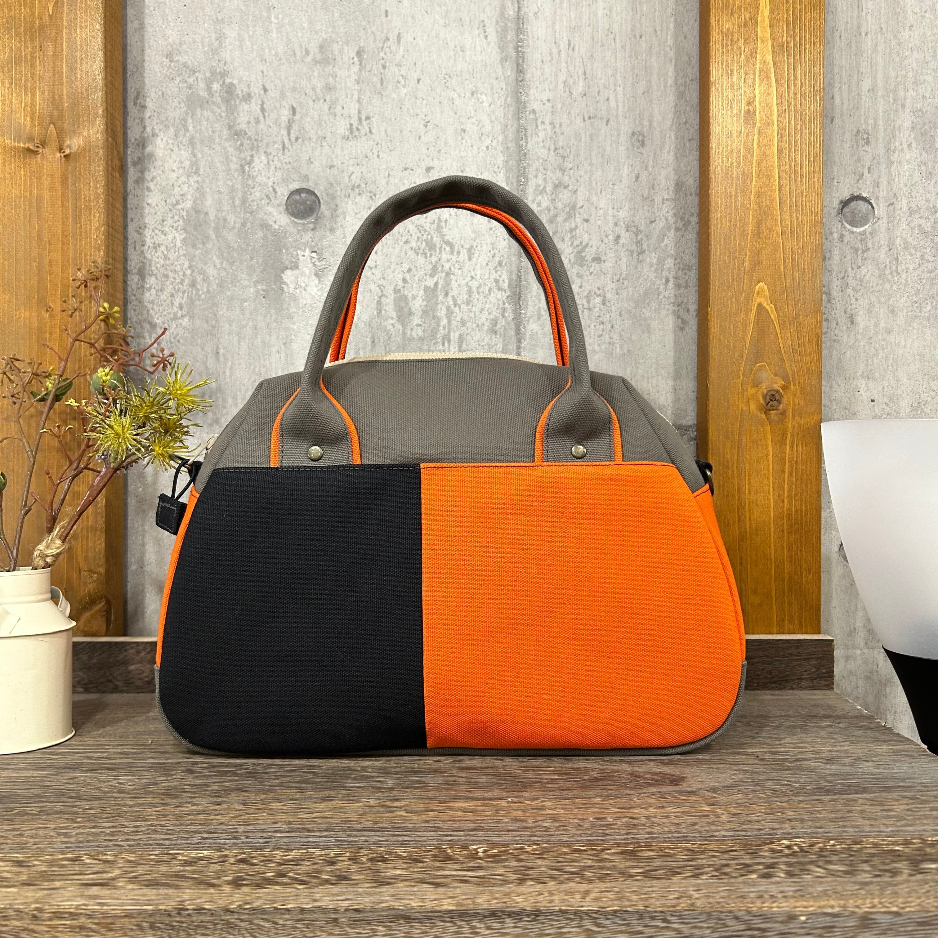 -* Boston Bag *- ブロック切替デザイン【スモーキーグレー×キャロット×ブラック】