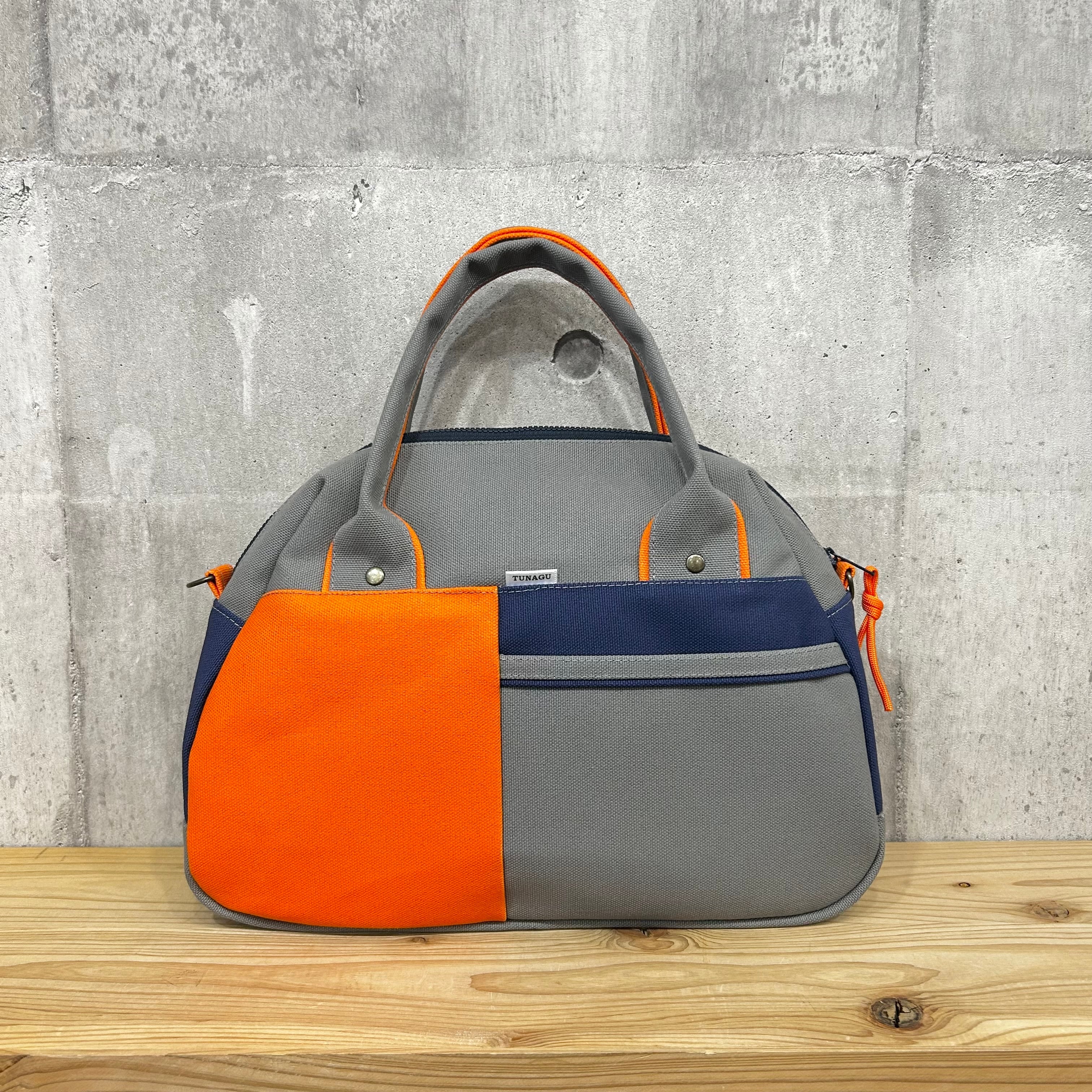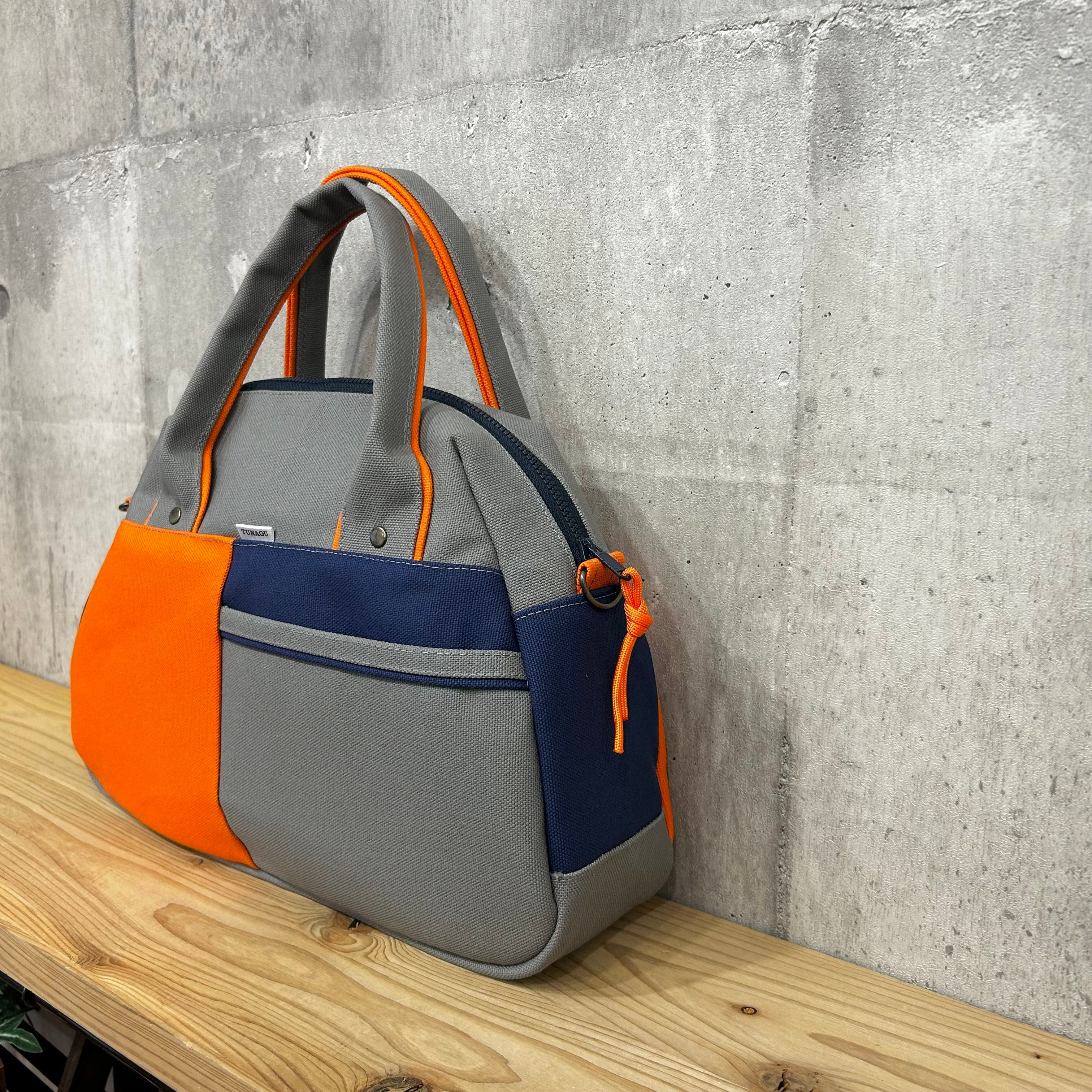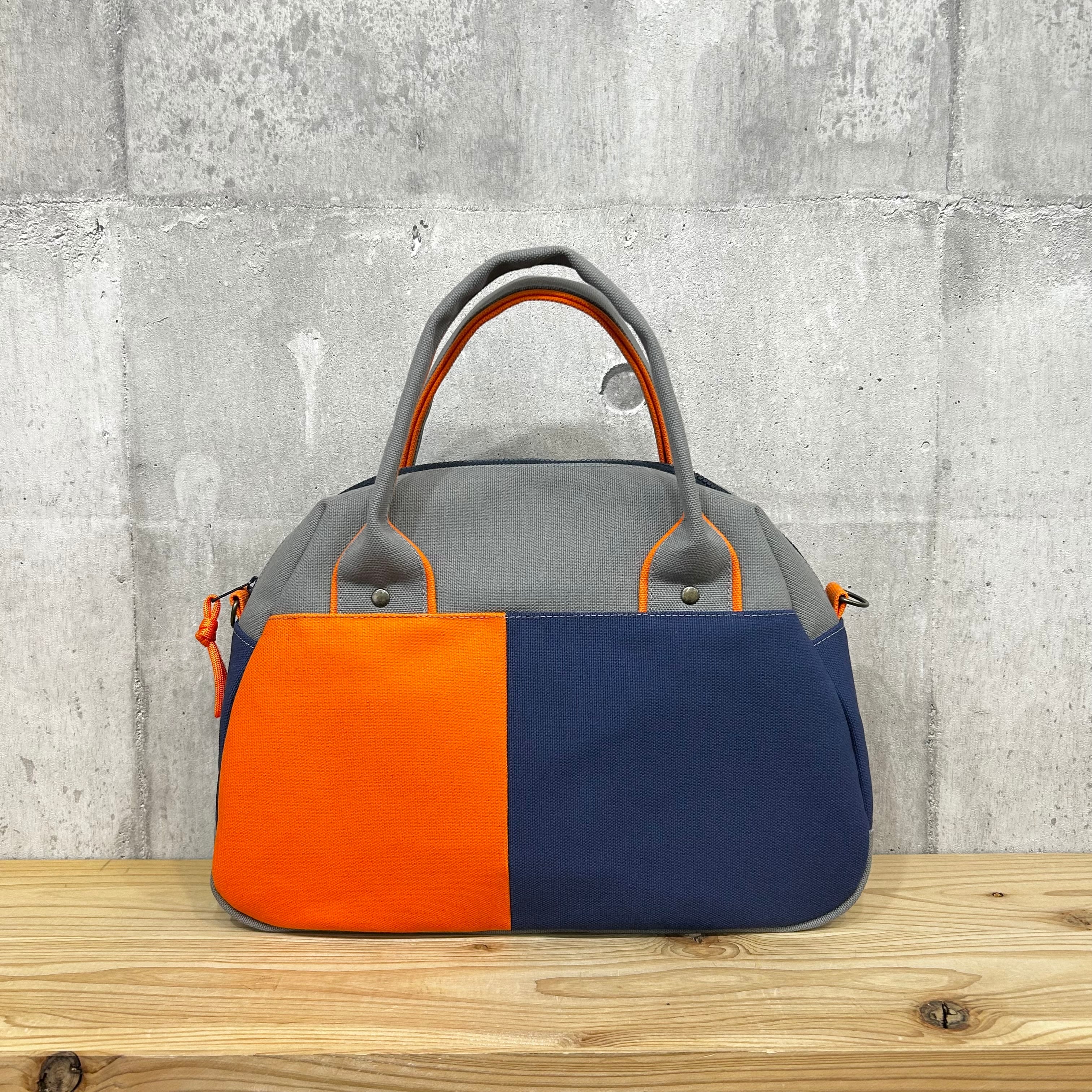 -* Boston Bag *- ブロック切替デザイン【グレー×オレンジ×紺】