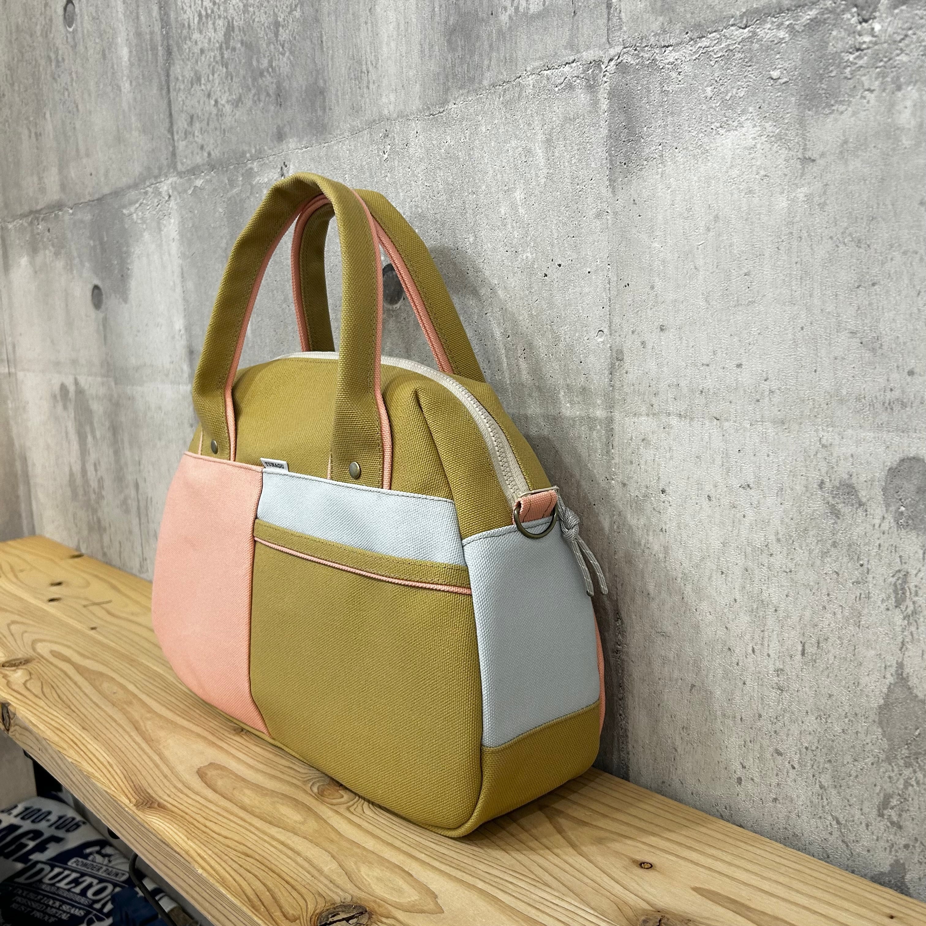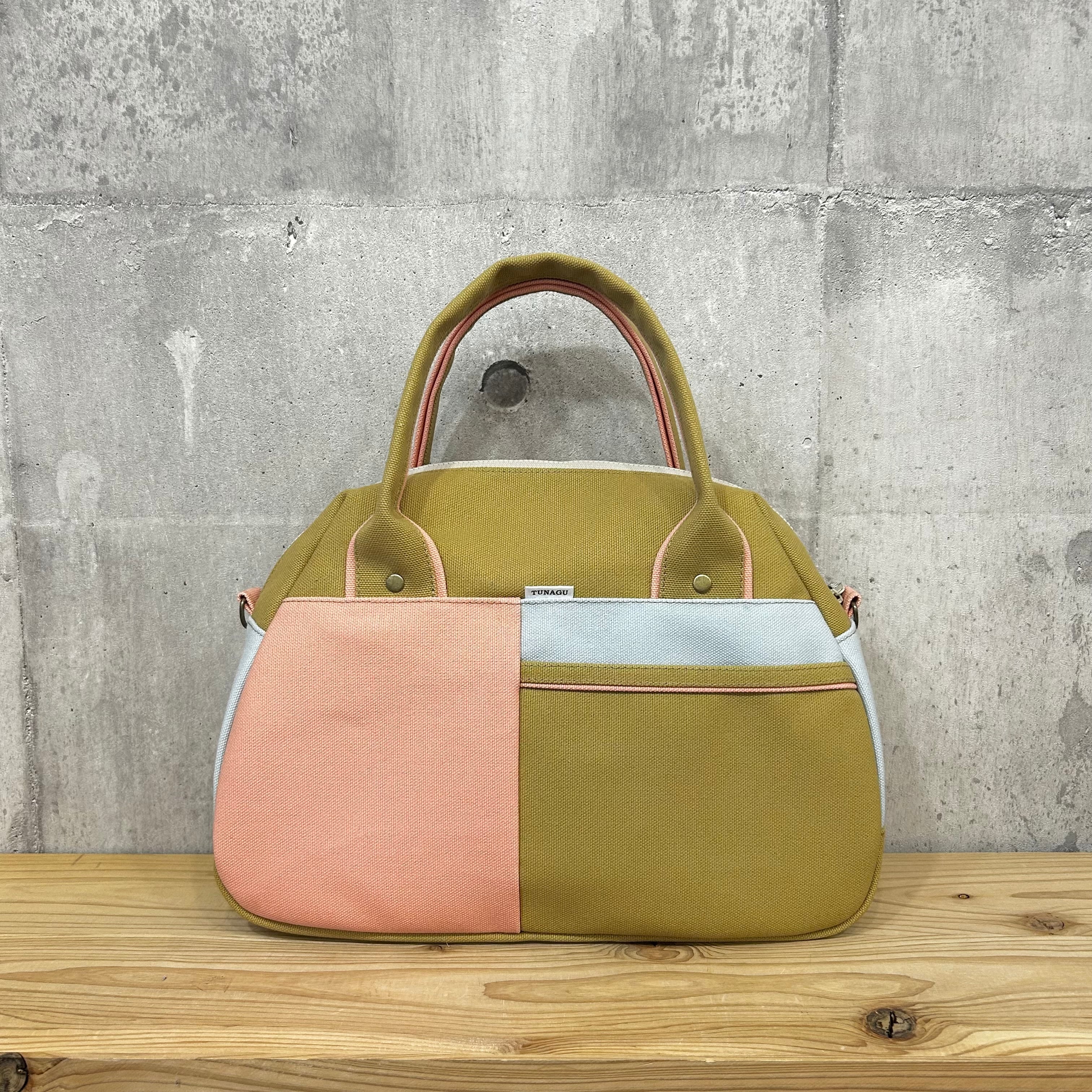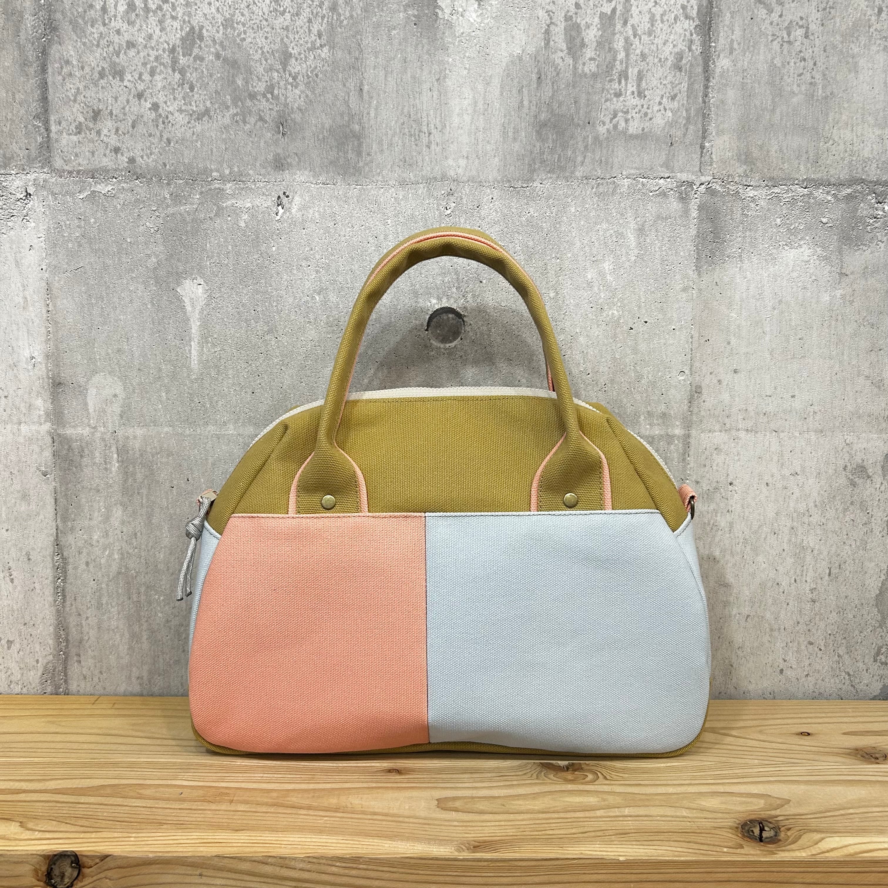 -* Boston Bag *- ブロック切替デザイン【ベージュ×シェルピンク×サックス】
